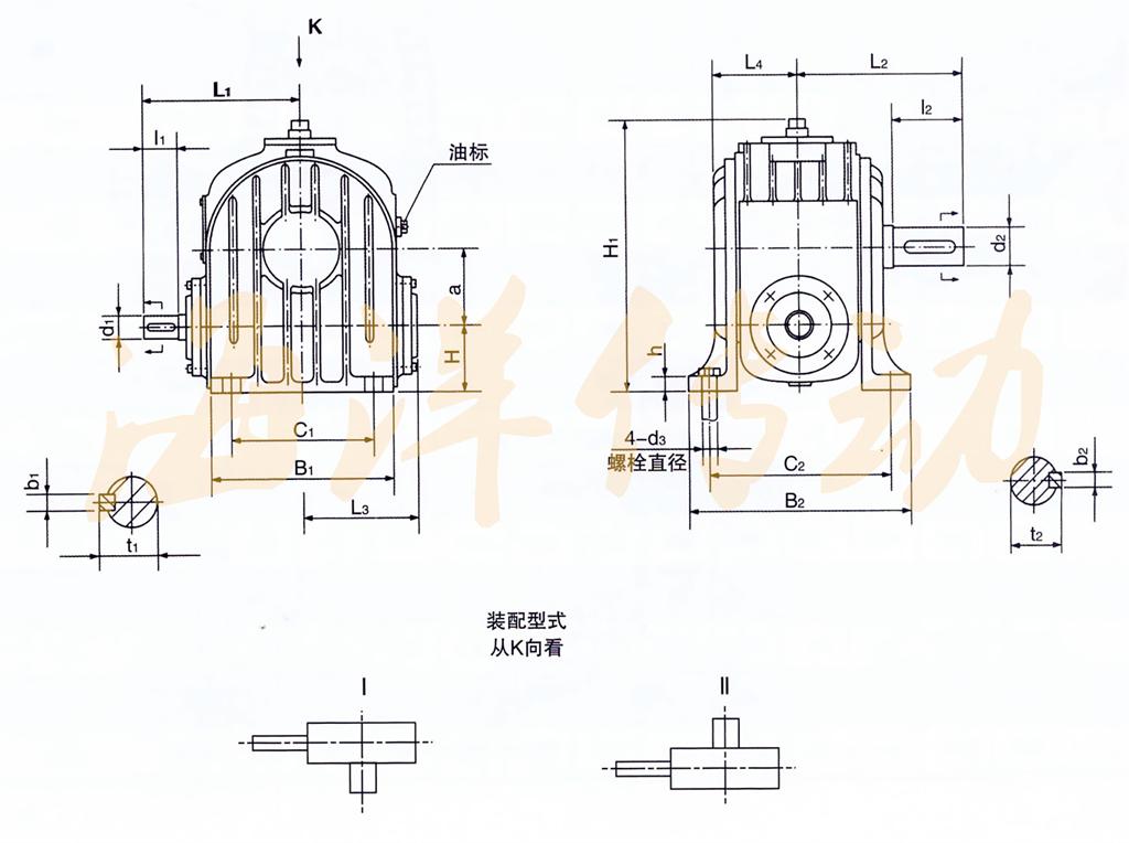 蝸桿轉速不超過1500r/min,蝸桿軸可正、反向運轉,工作環境溫度為-40℃~+40℃,當工作環境溫度低于0℃,啟動前潤滑油必須加熱到0℃以上,當工作環境溫度高于40℃必須采取冷卻措施。