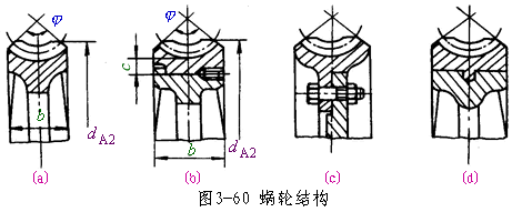 蝸輪常見的結(jié)構(gòu)有整體式和組合式兩種。鑄鐵蝸輪和小尺寸的青銅蝸輪常采用整體式結(jié)構(gòu)[圖3-60(a)]。尺寸較大時,為節(jié)省貴金屬多采用組合式,齒圈(輪緣)用青銅,而輪芯用鋼或鑄鐵。它們的組合方式有:過盈配合加緊定螺釘[圖3-60(b)];用絞制孔加螺栓聯(lián)接[圖3-60(c)];鑲鑄式,即將青銅齒圈澆鑄在鑄鐵輪芯上[圖3-60(d)]。