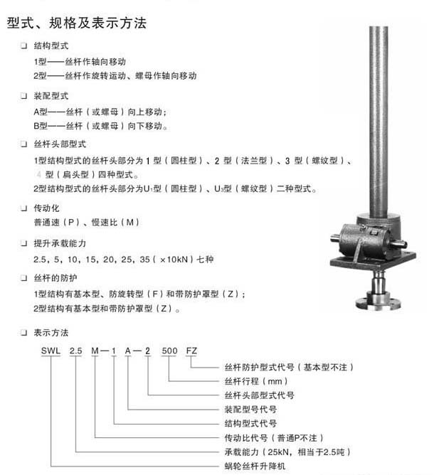 概述 SWL系列螺旋升降機廣泛應用于機械、冶金、建筑、水利設備等行業,具有起升、下降及借助輔件推進、翻轉及各種高度位置調整等諸多功能.SWL蝸輪絲桿升降機是一種基礎起重部件,具有結構緊湊、體積小、重量輕、動力源廣泛、無噪音、安裝方便、使用靈活、功能多、配套形式多、可靠性高、使用壽命長等許多優點。可以單臺或組合使用,能按一定程序準確地控制調整提升或推進的高度,可以用電動機或 其他動力直接帶動,也可以手動。它有不同的結構形式和裝配形式,且提升高度可按用戶的要求定制。 。該裝置可以自鎖
