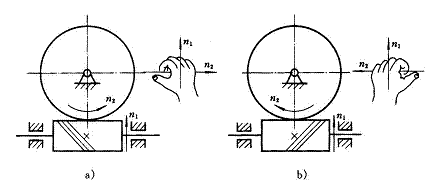 也就是蝸桿相對與蝸輪的移動方向。而事實上蝸桿是不能軸向移動的,故蝸輪在嚙合點的速度方向應指向相反方向,即Fa1的相反方向,既拇指的相反方向。