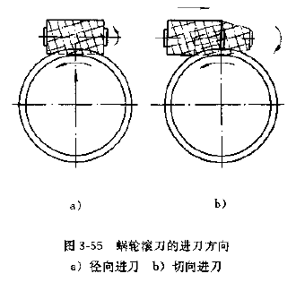 切制蝸輪時(shí),有兩種進(jìn)刀方法,徑向進(jìn)刀法和切向進(jìn)刀法,見(jiàn)圖3-55。